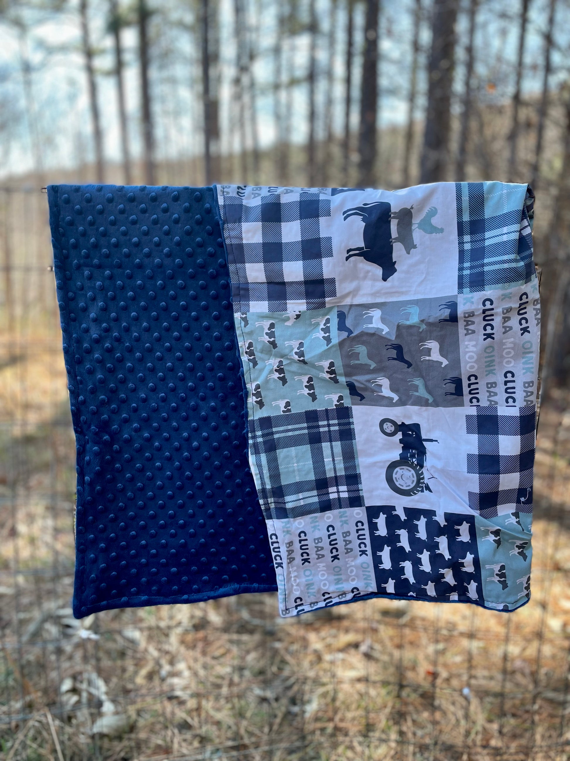 This baby boy quilt is perfect for your little one. Made with a durable cotton top and soft minky back for comfort, this farmhouse style quilt features a blue and farm animal pattern for a delightful look.